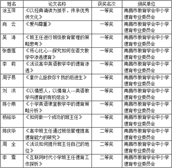 在南昌市教育学会中小学德育委员会第八届(次)学术年会上,我校涂玉萍、肖云等老师获一等奖,陈庆华等老师获二等奖。
