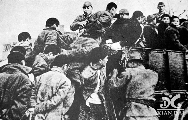 日军将大批南京青壮年捆绑后,押往郊外集体屠杀。图片来源:新华社