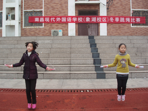 为更好地开展冬季体育运动,增强学生的体质,培养学生团结、拼搏的精神,12月23日,南昌现代外国语学校(象湖校区)举行了一场紧张、激烈的跳绳比赛。操场上一片欢腾景象,一根根彩绳、一个个纯真的笑脸在灿烂的阳光下飞舞、绽放。“各就各位,预备——跳。”“嚓嚓嚓”绳子不断拍打地面,啦啦队更是不甘示弱,喊得一阵比一阵响,喊得一阵比一阵亮。这次跳绳比赛凝聚了老师,同学的热情。比赛前,为集体争光的坚强信念每天激励着同学们努力练习,你追我赶,积极备战。比赛中,各个同学精神抖擞,信心十足,赛场上龙腾虎跃,身手不凡。终由四(7)班的邬梓贤与六(2)的徐宇豪分别以一分钟双脚跳216与210的好成绩共同获得一等奖。
